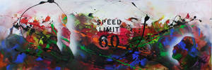 Ulf Røll Larsen. "Let's go faster for once". Akryl på lærred, overfladebehandlet med UVA lak. Sign. samt stemplet bag på lærredet. 50 x 150 cm (Dobbelt blændramme). Læs kunstnerprofil her