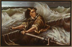 Kvinde i oprørt hav af John Weinreich, olie på lærred. Sign. monogram. 57 x 90 cm (62 x 95). Denne auktion er til fordel for Dyrenes Beskyttelse.