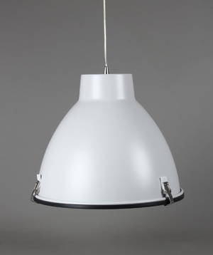 Industri pendel af lysegråt lakeret metal samt blændskærm af akryl, kantliste af sort gummi. H. 36 Ø 43 cm. Fremstår i emballage. Emballagemål: 39x46x46 cm. 4,2 kg.