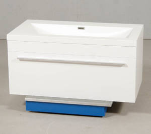 Badrumsmöbel, vit. Tvättställ i sanitetsakryl. Låda med handtag i aluminium. Bredd 90 cm, djup 48 cm, höjd 44 cm. Visningsexemplar.