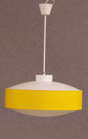 Uno & Östen Kristiansson, takarmatur i vit akrylplast, cylinderformad med pelarupphängning. Diameter 55 cm, höjd 80 cm. Tillverkad för Luxus, Vittsjö. Framstår med visst slitage. Lauritz.com garanterar inte funktionen.