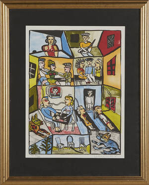 ULRIKA HYDMAN VALLIEN (1938-2018): Familjeliv i hyreshus, signerad Ulrica HC IV/XX, färglitografi, bildmått ca 42x31 cm. 879676.