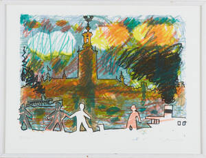 STIG CLAESSON "SLAS" (1928-2008): Stadshuset, Stockholm med figurer, signerad och daterad Stig Claesson -81, 128/150, färglitografi, bildmått ca 40x52 cm. 875131.