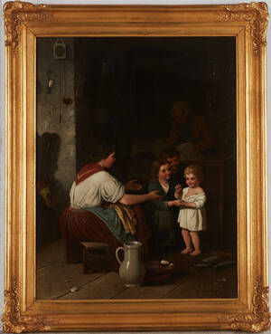 OIDENTIFIERAD KONSTNÄR (18/1900-tal): Interiör med familjescen, signerad T. Hermit, olja på duk, förefaller vara uppfordrad, ca 66x50 cm. Duklagning.