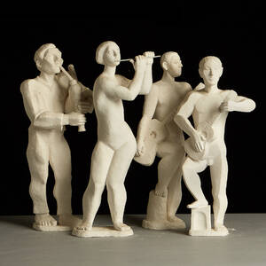 ROLAND ALF (1929-2020): (4) Musikanter, 3 signerade och daterade alf, 1 betitlad "Gitarrspelare" samt 1 betitlad "Gitarrackompanjemang", gips, höjd ca 41-45 cm. Ytsmuts.