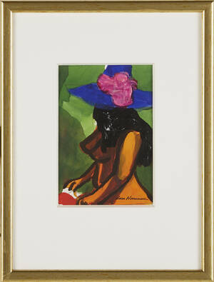 LARS NORRMAN (1915-1979): Dam med solhatt, signerad, blandteknik, ca 15x10,5 cm. 760383.