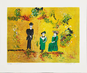 MADELEINE PYK (född 1934): Söndagspromenad II, signerad och daterad Madeleine Pyk -75, XIX / XXX, färglitografi, bladmått ca 65x78 cm. 751200.