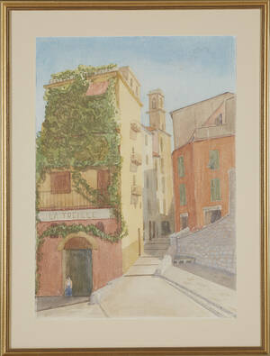 OIDENTIFIERAD KONSTNÄR, stadsamotiv från Frankrike, otydligt signerad, möjligen Bo Erik Lundqvist, daterad 1975, akvarell, mått ca 62x44 cm . Ej examinerad ur ram .