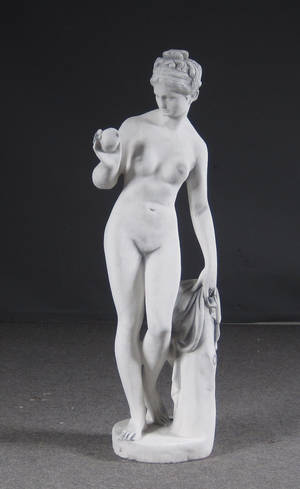 Haveskulptur af frostsikret støbt stenmateriale i form af Eva med æblet. H. 120 cm. Vægt: 71 kg. Kunden står selv for håndtering ved afhentning af varen.