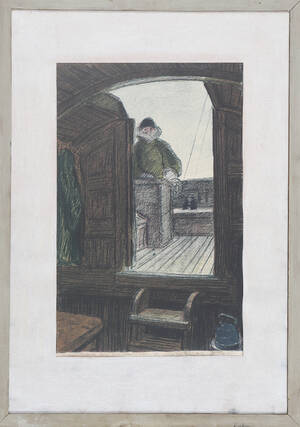 ROLAND SVENSSON (1910-2003): Vy från kabyssen, signerad och daterad Roland S -44, numrerad 4/35, färglitografi, ca 43x28 cm, med dedikation till Gunnar Reiss-Andersen. Fläckar i nedre marginalen.
