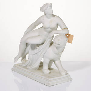 SKULPTUR, parian, omkring 1900, kvinnofigur på kattdjur, höjd ca 34, längd 18 cm. 681811.