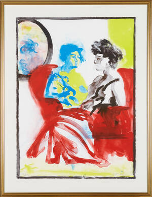 PETER DAHL (1934-2019): Samtal - röd fåtölj, signerad Peter Dahl, 182/290, färglitografi, bladmått ca 77x57 cm. 665182.