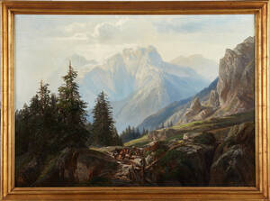 OIDENTIFIERAD KONSTNÄR (1800-talets slut): Alplandskap med kor, olja på duk, ca 69x97 cm. 654865.