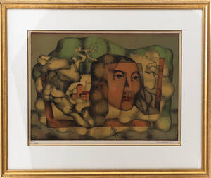 ERIK OLSON (1901-1986): Surrealistisk komposition med kvinnoansikte, signerad och daterad Erik Olson 1974, numrerad 259/260, färglitografi, dagermått ca 36x48 cm. 625483.