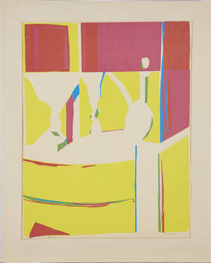 OLLE NYMAN (1909-1999): komposition, färglitografi, signerad och numrerad Olle Nyman, 200 ex, målad på baksidan, bladmått ca 60x48 cm. Löst blad, aningen gulnat, mindre revor vid kant .