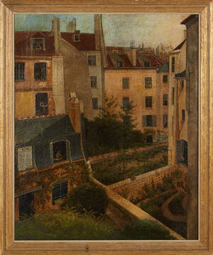 LINGLOIS (Frankrike, omkring 1830): Bakgård i Paris, olja på duk, ca 44x35 cm. Retuscher, lagningar.