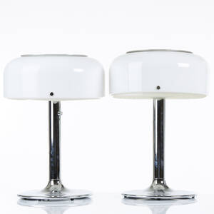 ANDERS PEHRSON, "Knubbling", bordslampor, 1 par, Ateljé Lyktan Åhus, formgivna 1971, förkromade stommar, kupor i vit akryl och galler i akrylplast, etikettmärkt, höjd ca 56 cm. Bruksslitage, ej funktionstestade, SAV garanterar ej funktionerna.