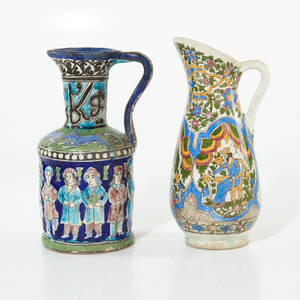KANNOR, 2 st. , lergods, Persien, 1900-tal, polykrom dekor, höjd ca 28-30 cm. Sprickor, slitage, retuscher, nagg.
