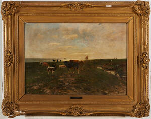 FRITZ GREBE (1850-1924): Kustbild med kor, signerad F Grebe, olja, 46x63 cm. Dubblerad, dukskador, dukrevor.
