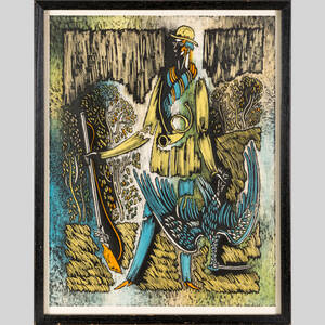 KASIULIS, Vytautas (1918-1995): Jägare med trofé, signerad Kasiulis, 8/50, färglitografi, ca 62x47,5 cm. 515626.