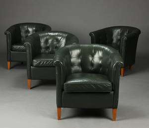 Lænestole betrukket med grønt skind, ben af bejdset bøgetræ. 1900-tallets slutning. Fremstår med lettere slitage, enkelte mærker og trykmærker. Arkivfoto. (4)