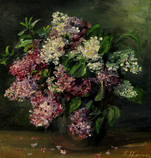 Emmy Thornam. Opstilling med blomstrende syrener. Olie på lærred.