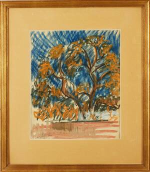 INGE SCHIÖLER (1908-1971): "Träd mot blå himmel", signerad Inge Schiöler, pastell, 42x35 cm. 455853.