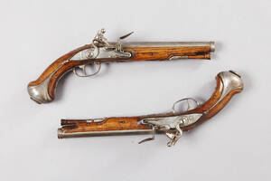 FLINTLÅSPISTOLER, 1 par, brittiska, 1700-talets andra hälft, signerad Joyner, London (John Joyner), boxlås, avgängbar pipa, kolv med silveringläggningar, pipa med proof-marks, längd ca 21 cm. Läs mer...