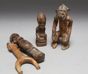 SKULPTURER, 3 st. , SLANGBELLA, Baule Elfenbenskusten samt Bayaka Kongo, trä, höjd 11-18 cm. 108153.