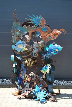 Mexikansk Skulptur i form af koralrev. Udført i bemalet smedejern med løst hængende fisk m. m. H. 210 cm. Fremstår med rust på fod.