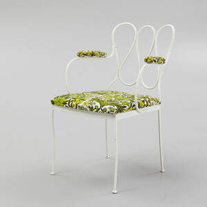 Vitlackerad stomme med stoppad, textilklädd sits och armlän. Sitthöjd ca 44 cm. Smärre slitage. Senare målning samt sits.