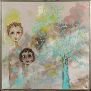 Anni Grøndahl. Akryl på lærred. "Søstrenes forår", sign. AG samt bagpå lærred. 100x100 cm. (104x104 cm. inkl. lærred.). Anni Grøndahl har udstillet på bl.a.: Censurerede udstillinger: Limfjorden Struer, Tobaksfabriken Lemvig, Forår og Kunst, Aalborghallen 2007+2009, Decemberudstillingen Dronninglund Kunstcenter 2007, Vendsyssel Censurerede 2008+2009, KS Tistrup 2009, Nordjysk Censureret 2009 (Dronninglund Kunstcenter).
