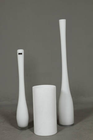 Hemphrey. Mundblæste unikavaser: To "Almost tall enough" gulvvaser, H: 68-96 cm. og en cylindervase, H: 40 cm. Vaserne er restlager fra Illums bolighus. Vaserne er unika produkter, hvor ikke to varer er ens. Inspirationen er kommet fra en stor lyst til at udfordre. Dette kommer til udtryk i produkter, der er op til 100 cm. høje, hvilket er den maksimale længde for mundblæst glas. Varerne er limited edition og nye og ubrugte. (3)