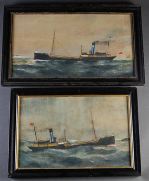 Ubekendt kunstner, marineportrætter af 'SS Spurnpoint Cardiff' akvarel på papir. Den største 30 x 54,5 cm (38 x 62,5 cm). Fremstår med pletter, 1800-tallet. (2)