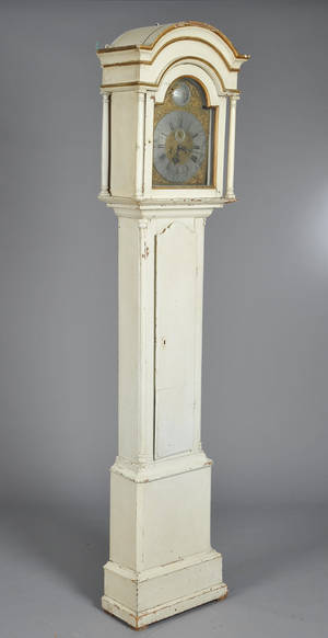 Jens Chr. Jensen m.fl. Bornholmsk Frøken standur med kasse af hvidmalet og guldstafferet træ, hvidmalet urskive med romer- og arabertal, betegnet Jens Chr. Jensen, Rønne, Läs mer...