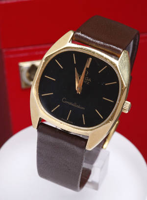 Omega Constellation armbåndsur. Urkasse af 18 kt. guld monteret med brun original læderrem med originalt spænde. Sort urskive med baton timemarkeringer og dauphine visere. Quartzurværk. 32 x 36 mm. Uret er med trykknap krone, den lille viser stilles manuelt, den store trykkes frem. Uret er oprindelig erhvervet i 1982, regning medfølger samt original Omega boks. Uret fungerer. Lauritz.com garanterer ikke for funktionalitet.