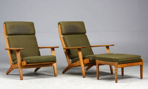 Hans J. Wegner 1914-2007. Par Højryggede lænestole af egetræ samt én tilhørende skammel, løse hynder betrykket med originalt uldstof. Fremstillet hos Getama, model GE-290 A. Fremstår med brugsspor på polstring. (3) Se endvidere varenr. 2737324 samt 2737329.