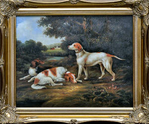 Ubekendt kunstner. Parti med jagthunde. Bemalet tryk på plade. Usign.. 30 x 38 cm (39 x 47 cm).