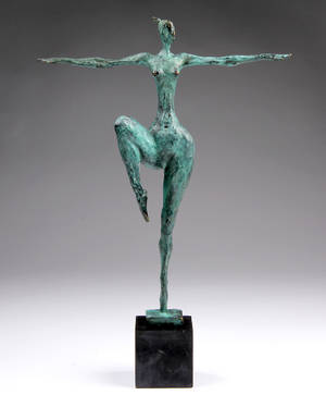 'Nøgen kvinde', figur af grønpatineret bronze stående på sortbroget sokkel. Signeret ?Milo ? i bronzen. H 52, B 35 cm. Vægt 3,5