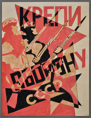 Ubekendt kunstner, russisk avantgarde. Slagskib - 'Styrk forsvaret'. Gouache på papir. Sign. Uindrammet. 33 x 25 cm. Fremstår med håndteringsmærker samt enkelte pletter.