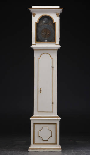 Jens Chr. Jensen m.fl. Bornholmsk Frøken standur med kasse af hvidmalet og guldstafferet træ, hvidmalet urskive med romer- og arabertal, betegnet Jens Chr. Jensen, Rønne, Läs mer...