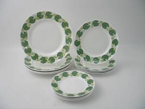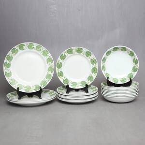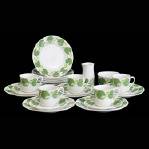 Grön dekor av näckros mot vit fond. 5 kaffekoppar med fat, 12 assietter, sockerskål och gräddkanna. "Näckros" tillverkades 1970-1973. Smärre bruksslitage, en kopp med bruksslitage. Läs mer...