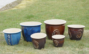 Sæt havekrukker, blå- og brunglaserede. H. 32,diam. 38. H. 17,diam. 21 cm. (6)