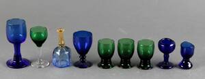Samling ældre effekter af glas bestående af: to øjeglas ( et med små chips på kant), Kosta Boda miniature vase, tre grønne glas H. 6 Läs mer...