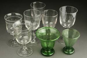 Samling ældre glas formentlig fra 1800-tallet, bestående 6 glas på dråbeformet stilk, to med gravering, to med slibning og to uden. Desuden to pokaler af Läs mer...