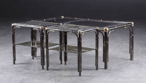 Rektangulært sofabord, stel af forgyldt metal, udformet som bambus, plade af glas H. 50 cm L. 118 cm B. 62 cm. Derudover par tilsvarende lampeborde Läs mer...