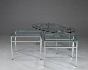 To sideborde/lampeborde og et sofabord, stel af stål, plader af glas. Sideborde: H. 50 L. 60 D. 45 cm. Sofabord: H. 50 L. 118 B. Läs mer...