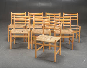 Poul M. Volther. Otte spisebordsstole model 350, med stel af massivt bøge- og egetræ, sæder med papirgarnsflet. H. 77, Sh 42, B. 44 cm. Fremstår Läs mer...