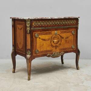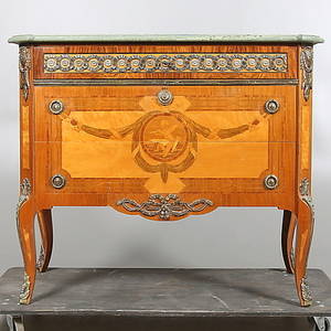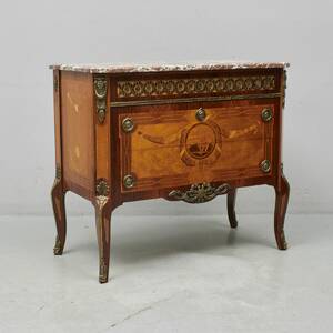 Beslag av metall, dekor med intarsia, stenskiva. 3 lådor i front. Bredd/längd 97, djup 53, höjd 84 cm.