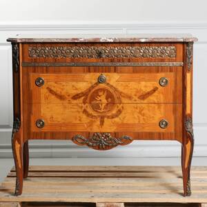 Byrå, Hauptstil / gustaviansk stil, 1900-tal. Rak form med avfasade hörn. Tre lådor. Bronsbeslag. Lådfronter med samkomponerad inatsriadekor i form av putto. Marmorskiva. L 95, Läs mer...